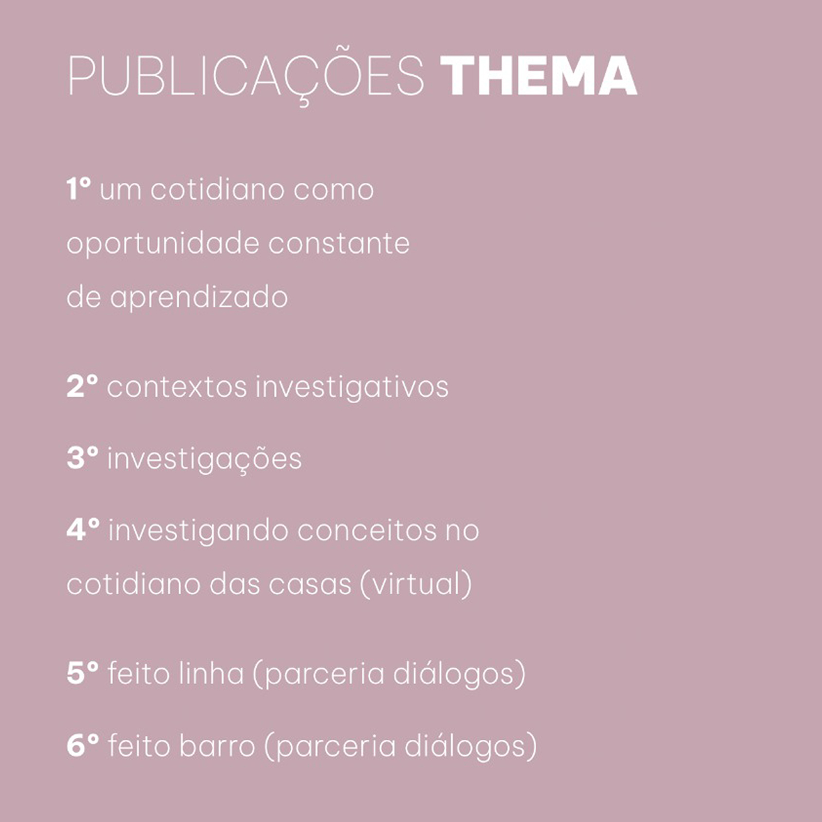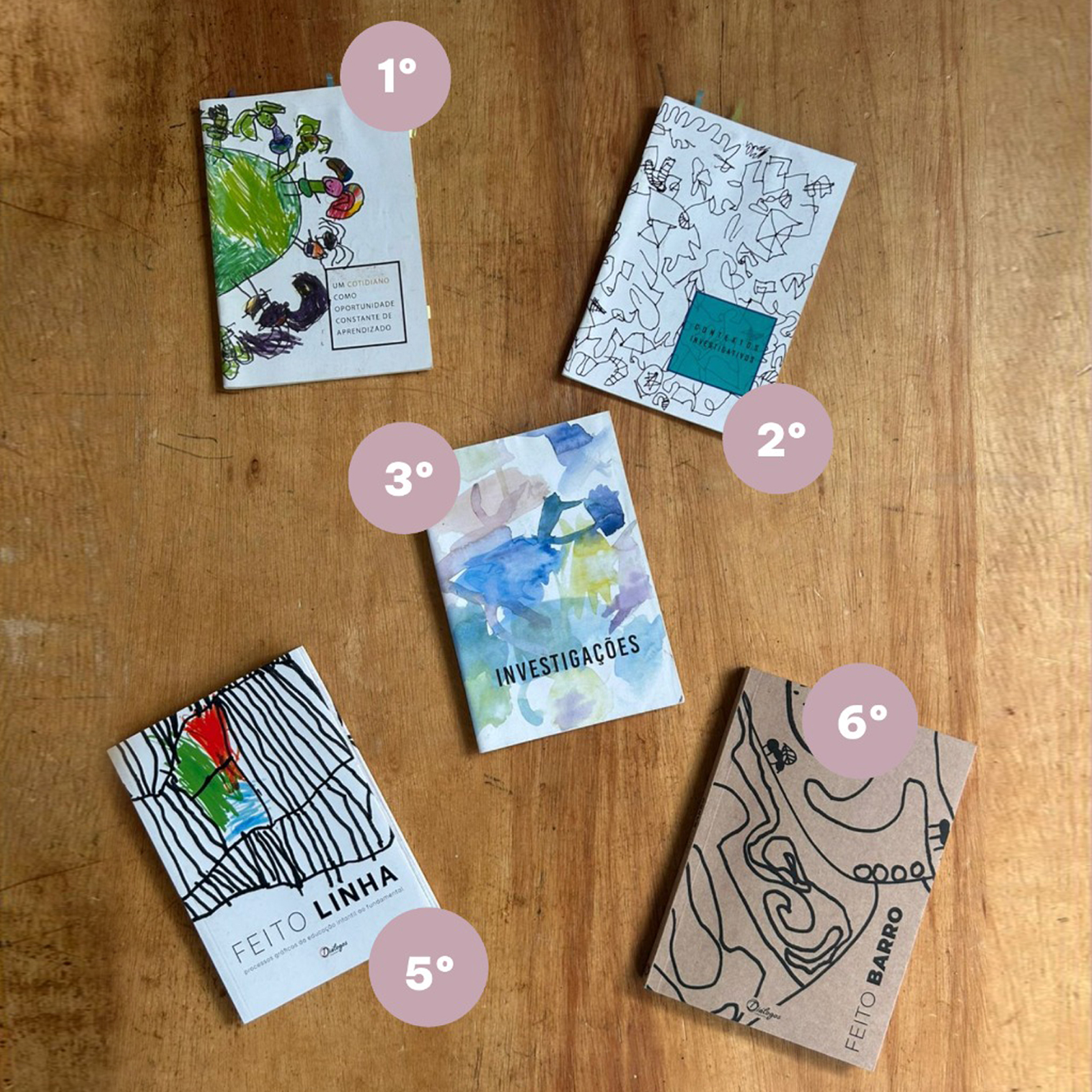 As quinta e sexta publicações, Feito Linha e Feito Barro, deslocam o foco para as linguagens. Elas falam dos modos como as crianças investigam os diferentes sujeitos, conceitos e mundos por meio do corpo, do traço, da matéria, da linha, do barro: linguagens que não ilustram o pensamento, mas são o próprio pensamento em ação.